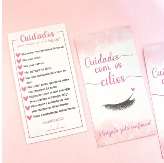 Produto Pronta entrega - Não personalizamos - Impressão frente e verso colorida - Tamanho: 9x5cm - Pacote com 100 unidades - Papel Couchê 250g - Papel e impressão de excelente qualidade Oriente suas clientes com o nosso lindo cartão de cuidados com os cílios.