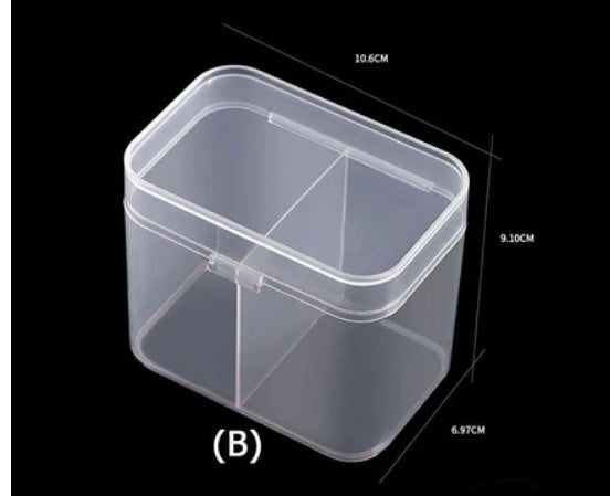 (B) formato arredondado com 2 divisórias e tampa unica: Altura: 9,10 cm Largura: 6,97 cm Comprimento: 10,6 cm Caixa pode ser usada para guardar vários tipos de objetos, pratica e portátil.